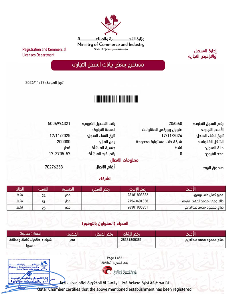 في جلوبال ووركس، نفخر بالتزامنا بالقانونية والشفافية. يتميز ملف تعريف شركتنا بسلسلة من شهادات التسجيل المرموقة، والتي تعمل كدليل على مكانتنا القانونية.